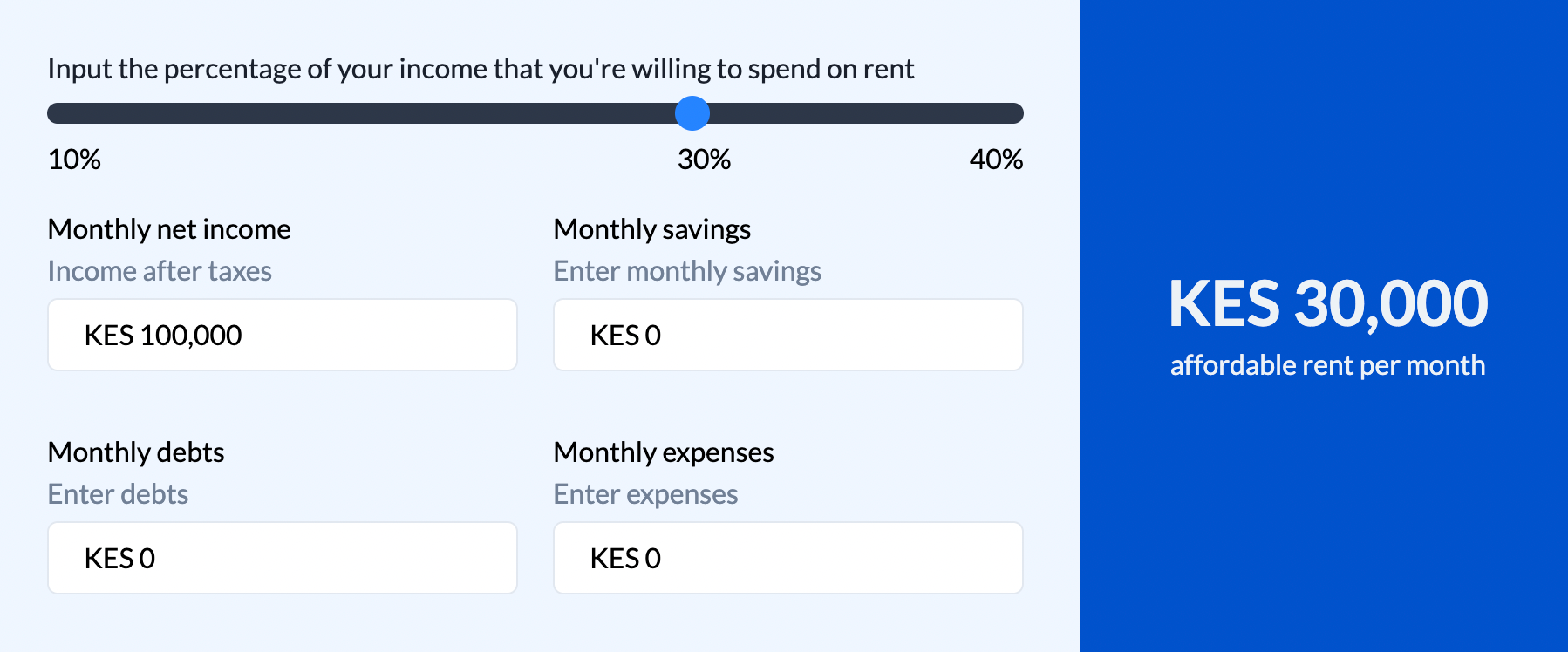 A common rule of thumb is to spend no more than 30% of your net monthly income on rent. This means your income after taxes and deductions. For example, if you earn Ksh 80,000 per month, your rent should not exceed Ksh 24,000 per month. Use this calculator and adjust this to your suited amount.